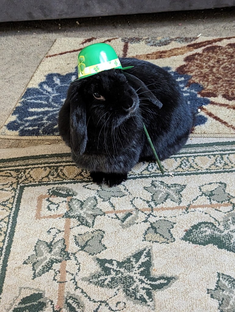 This is Felix, my daughter’s lop eared rabbit. The thing about Felix is he’s the friendliest rabbit I’ve ever seen. He’ll jump up onto the couch when we sit there and get into our lap and lick our face. He also enjoys following us around the house. He enjoys playing a game where he’ll knock down empty plastic bottles with his head that are on the floor. He also picks up socks with his teeth and throws them around. We’ve had him since he was 4 weeks old and he’s always been free range. He does have a cage that he goes into where we keep his food and Timothy hay just to keep things neat and clean for easier clean up. He also uses a litter box because rabbits are very smart and can easily be trained. Have a wonderful day and Happy Saint Patrick’s Day. β˜˜οΈπŸ’šπŸ₯¦πŸ₯¬πŸ₯•